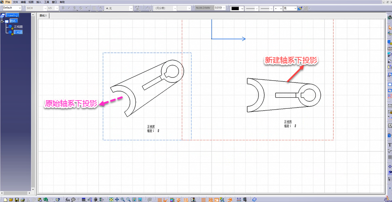 (3) 比較選擇原始軸系和新建軸系下不同的投影圖: