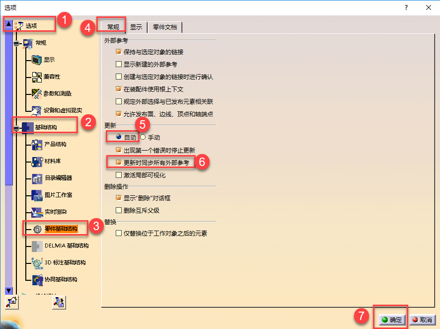 2)在首選項(xiàng)設(shè)置的基礎(chǔ)結(jié)構(gòu)>零件基礎(chǔ)結(jié)構(gòu)>常規(guī)目錄下:更新勾選自動(dòng)/勾選更新時(shí)同步所有外部參考,可實(shí)現(xiàn)在界面進(jìn)行快速更新