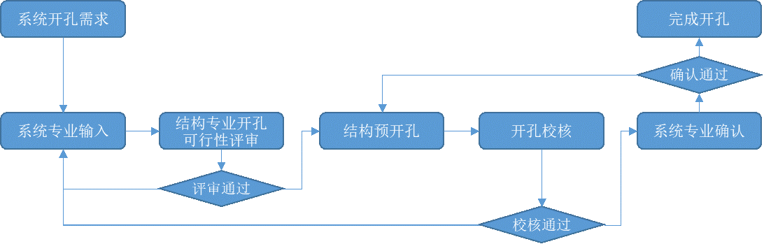 然而,在提高預(yù)開孔率的前提下,還得保證開孔的正確率。因?yàn)轭A(yù)開孔相當(dāng)于把現(xiàn)場(chǎng)開孔工序前移到生產(chǎn)設(shè)計(jì)階段,如果在設(shè)計(jì)階段發(fā)生錯(cuò)誤,會(huì)直接導(dǎo)致生產(chǎn)現(xiàn)場(chǎng)無(wú)法安裝,造成返工。因此,必須要以嚴(yán)謹(jǐn)和規(guī)范的流程來(lái)管理各專業(yè)之間的協(xié)同開孔設(shè)計(jì)。
