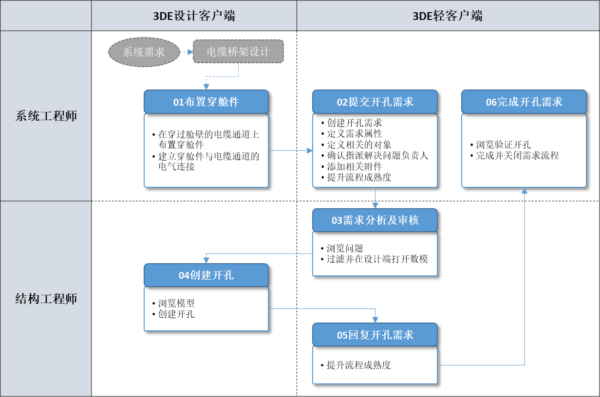 基于3DE平臺(tái)的協(xié)同設(shè)計(jì)解決方案可以滿足開孔管理流程需要,包括各個(gè)專業(yè)的總體布置、詳細(xì)建模、協(xié)調(diào)評(píng)審、結(jié)構(gòu)強(qiáng)度校核、優(yōu)化修改、輸出生產(chǎn)圖紙等。