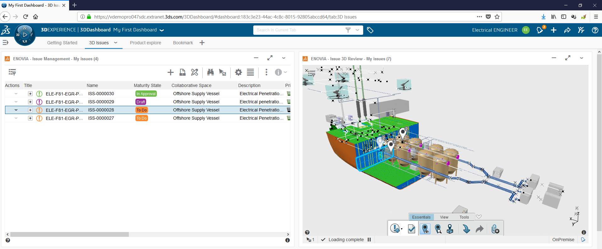 系統(tǒng)工程師登錄3DE網(wǎng)頁(yè)輕客戶端,進(jìn)入到3DDashboard模塊。通過(guò)Issue Management和Issue 3D Review兩個(gè)模塊可以對(duì)應(yīng)交叉瀏覽和管理與當(dāng)前用戶的相關(guān)問(wèn)題。