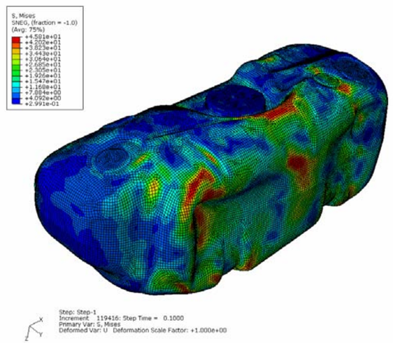 當(dāng)前,ABAQUS 軟件已經(jīng)在汽車燃油箱仿真中得到了很好的應(yīng)用,同時(shí)用戶也通過使用 ABAQUS軟件對汽車燃油箱進(jìn)行仿真,使其在產(chǎn)品開發(fā)階段即可發(fā)現(xiàn)產(chǎn)品的設(shè)計(jì)缺陷,有利于提高產(chǎn)品質(zhì) 量并加速產(chǎn)品開發(fā),并有效的減少研發(fā)成本。圖1 及圖2 給出了某汽車燃油箱生產(chǎn)廠商使用 ABAQUS 軟件對燃油箱進(jìn)行耐壓及撞擊模擬得結(jié)果。