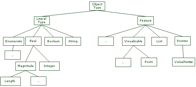 所有類型都為基本類型ObjectType 的派生類型。從ObjectType往下派生出Feature特征類型與Literal字面類型。