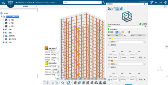 線鋼筋:使用自由繪制的曲線創(chuàng)建鋼筋,包括創(chuàng)建各種復(fù)雜鋼筋:板凳筋、桁架鋼筋、型鋼柱復(fù)雜鋼筋等,充分發(fā)揮達(dá)索系統(tǒng)3DEXPERIENCE平臺(tái)強(qiáng)大的曲線、曲面設(shè)計(jì)功能優(yōu)勢(shì)。