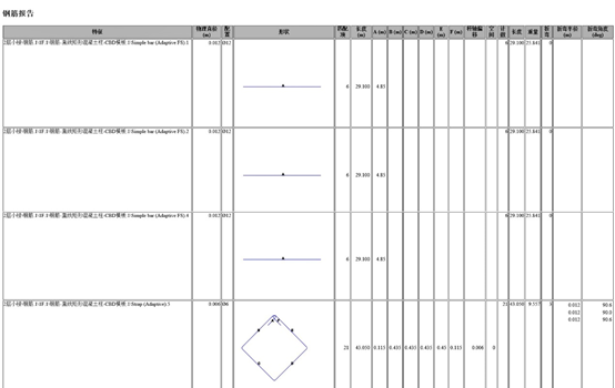 完成鋼筋建模后,選中目標(biāo)鋼筋,一鍵實(shí)現(xiàn)鋼筋算量,鋼筋算量結(jié)果包括每根鋼筋的規(guī)格、形狀、數(shù)量、長(zhǎng)度、重量、每處折彎長(zhǎng)度,結(jié)合三維模型指導(dǎo)鋼筋彎折生產(chǎn)。