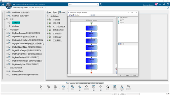 水工專業(yè)作為水電站設(shè)計(jì)的重要專業(yè)與其它各專業(yè)設(shè)計(jì)都相關(guān),所以它是設(shè)計(jì)的重點(diǎn)也是難點(diǎn),根據(jù)不同類型的水電站水工專業(yè)包含不同設(shè)計(jì)內(nèi)容,以拱壩為例,水工專業(yè)包括擋水工程、泄水工程、廠房、水道等內(nèi)容,為了保證水工設(shè)計(jì)的準(zhǔn)確性以及高效性,通過(guò)達(dá)索系統(tǒng)3DEXPERIENCE平臺(tái)自帶的KAC開發(fā)功能,定制開發(fā)基于不同水電站主體部分的標(biāo)準(zhǔn)設(shè)計(jì)流程,其余部分可以基于達(dá)索系統(tǒng)3DEXPERIENCE平臺(tái)的基本模板進(jìn)行設(shè)計(jì)。