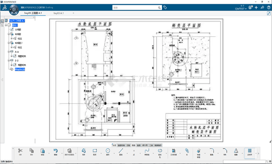在完成模型構(gòu)建后,基于三維模型工程出圖,部分樞紐布置圖及建筑物位置示意圖可選用達(dá)索系統(tǒng)3DEXPERIENCE平臺(tái)的2D Layout模塊應(yīng)用出圖,可以實(shí)現(xiàn)三維展示效果的出圖。詳細(xì)施工圖紙需要在達(dá)索系統(tǒng)3DEXPERIENCE平臺(tái)的Drafting模塊出圖,工程圖完成后可生成PDF或其它文件格式交付。