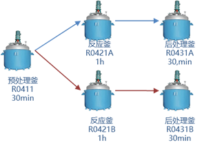 下圖是客戶設(shè)備架構(gòu)的示意圖,作業(yè)指令的下達是按照產(chǎn)線來下達的,工單A可以投產(chǎn)到R0411,R0421A,R0431A, 工單B可以投產(chǎn)到R0411,R0421B,R0431B。在下達生產(chǎn)工單時,既要看生產(chǎn)線,按照生產(chǎn)計劃下達到不同的生產(chǎn)線,同時還有看設(shè)備,當工單A在預(yù)處理釜R0411生產(chǎn)時,工單B不能下達,只有當工單在反應(yīng)釜R0421A生產(chǎn)時,此次R0411空下來,工單B才能下達。