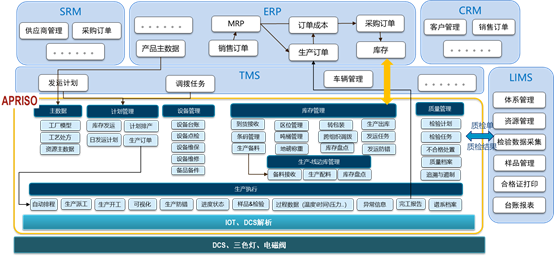 同時作為智能工廠核心系統(tǒng)的,MOM系統(tǒng)同ERP、TMS、LIMS、DCS安環(huán)等系統(tǒng)集成。