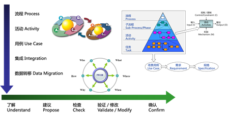 如圖2所示,在方案設(shè)計(jì)的過(guò)程,方案顧問(wèn)需要在了解客戶需求后,進(jìn)行業(yè)務(wù)需求與系統(tǒng)的匹配。業(yè)務(wù)需求依照流程(Process)→活動(dòng)(Activity)→用例(Use Case)→集成(Integration)→數(shù)據(jù)遷移(Data Migration)逐步細(xì)化了解;而系統(tǒng)方案的定義,從了解(Understand)→建議(Propose)→檢查(Check)→驗(yàn)證/修改(Validate/Modify)→確認(rèn)(Confirm)逐步完成。