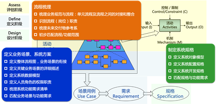 針對(duì)每一個(gè)業(yè)務(wù)活動(dòng)(用例),方案顧問(wèn)需要了解該活動(dòng)所需要的輸入、產(chǎn)生的輸出、責(zé)任人、參與者以及業(yè)務(wù)上需要哪些約束(控制╱限制)和業(yè)務(wù)邏輯(機(jī)制)。
